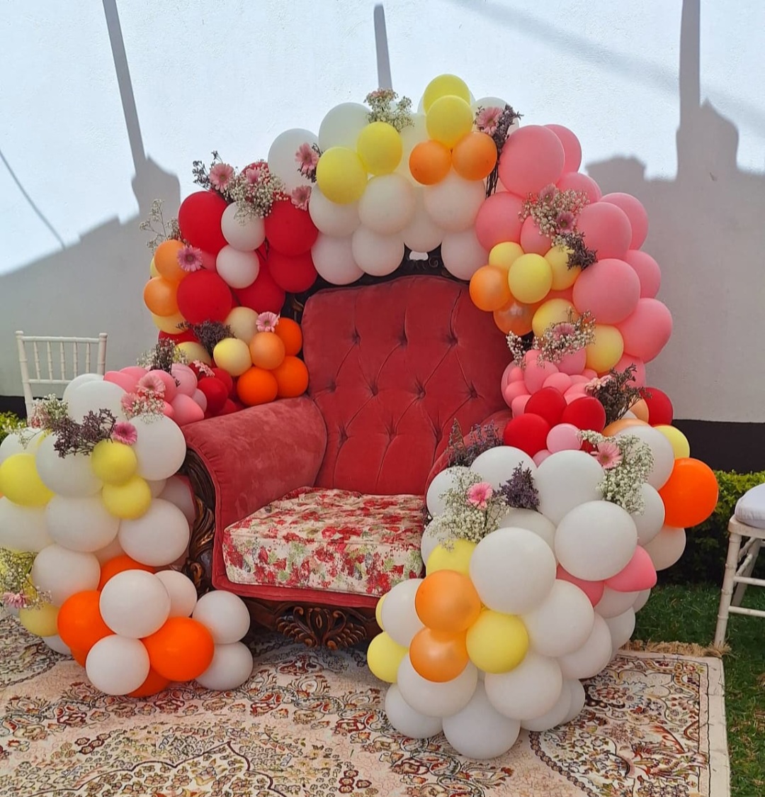 Elegant balloon setup for a baby shower & gender reveal party. Mum to be queen chair. We are experts in balloon and drapery setups making your event elegant and memorable.